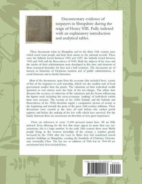These Shropshire tax records from Henry VIII's time reveal the beginning of the modern income tax system. They are of interest to tax historians and to social historians. Family historians will also find the large number of names in the records a rare source for time before most of the earliest surviving parish register s and for which few wills exist. The comprehensive index aids searches. The book contains transcriptions or abstracts of the surviving papers of the lay subsidies of 1523-1527 and 1543-1545 and the benevolence of 1545. 70%% of these records are new and have not been published before. The documents have been formatted to replicate the lay-out of the original documents and to make reading easier. Most of the documents are in the form of lists, usually set out by township. They show the taxpayers of each small locality with their assessments according to their individual wealth and provide a picture of society and of social structure at the critical time of the mid-16th century inflation.
