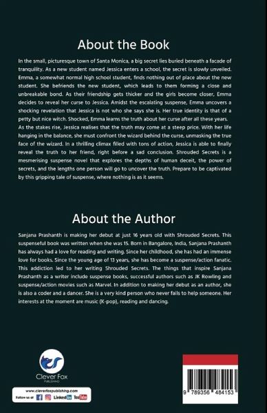 In the small, picturesque town of Santa Monica, a big secret lies buried beneath a facade of tranquility. As a new student named Jessica enters a school, the secret is slowly unveiled. Emma, a somewhat normal high school student, finds nothing out of place about the new student. She befriends the new student, which leads to them forming a close and unbreakable bond. As their friendship gets thicker and the girls become closer, Emma decides to reveal her curse to Jessica. Amidst the escalating suspense, Emma uncovers a shocking revelation that Jessica is not who she says she is. Her true identity is that of a petty but nice witch. Shocked, Emma learns the truth about her curse after all these years. As the stakes rise, Jessica realises that the truth may come at a steep price. With her life hanging in the balance, she must confront the wizard behind the curse, unmasking the true face of the wizard. In a thrilling climax filled with tons of action, Jessica is able to finally reveal the truth to her friend, right before a sad conclusion. Shrouded Secrets is a mesmerising suspense novel that explores the depths of human deceit, the power of secrets, and the lengths one person will go to uncover the truth. Prepare to be captivated by this gripping tale of suspense, where nothing is as it seems.