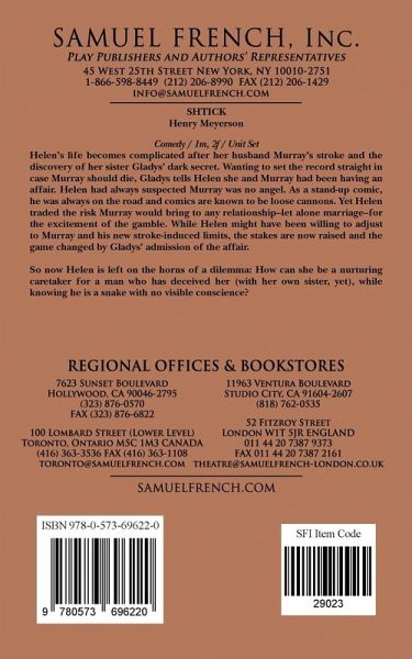 Comedy / 1m, 2f / Unit Set Helen's life became complicated after her husband Murray's stroke and her sister Gladys's revelation, wanting to set the record straight in case Murray should die, that she and Murray had been having an affair. Helen suspected Murray was no angel when she married him. After all, as a stand-up comic he was always on the road and she knew comics could be loose cannons. Helen knew she was trading the risk Murray would bring to any relationship, let alone marriage, for the excitement of the gamble. While Helen might have been willing to adjust to Murray and his new stroke induced limits, the stakes were raised and the game was changed by Gladys's admission of the affair. So now Helen is left on the horns of dilemma: How can she be a nurturing caretaker for a man who has deceived her (with her own sister, yet) while knowing he is a snake with no visible conscience?