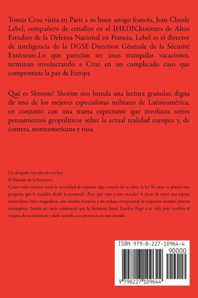 Tomás Cruz visita en Paris a su buen amigo francés, Jean Claude Lebel, compañero de estudios en el IHEDN,Instituto de Altos Estudios de la Defensa Nacional en Francia, Lebel es el director de inteligencia de la DGSE-Direction Générale de la Sécurité Extérieure.Lo que parecían ser unas tranquilas vacaciones, terminan involucrando a Cruz en un complicado caso que compromete la paz de Europa Qué es Shtorm? Shortm nos brinda una lectura granular, digna de uno de los mejores especialistas militares de Latinoamérica, en conjunto con una trama expectante que involucra serios pensamientos geopolíticos sobre la actual realidad europea y, de contera, norteamericana y rusa.