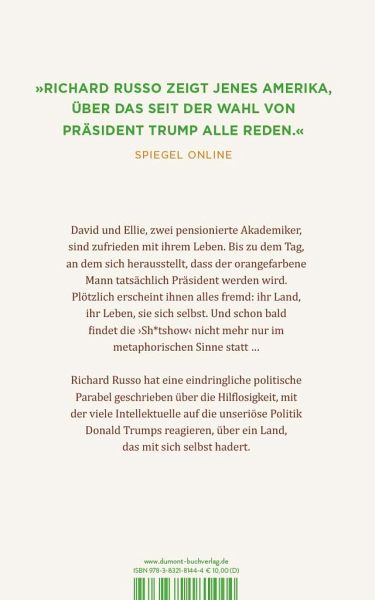 David und Ellie, zwei gutsituierte, in der Großstadt lebende, pensionierte Akademiker sind zufrieden mit ihrem Leben. Bis zu dem Tag, an dem Donald Trump zum Präsidenten gewählt wird. Plötzlich wird ihnen alles fremd: ihr Land, ihr Leben, sie sich selbst. Ihre Tochter, die längst im liberalen Kalifornien lebt, kann ihnen nicht helfen. Und dann ist da noch dieser Freund, von dem sie glauben, dass er nur so tut, als hätte er Hillary gewählt ...Spätestens als Ellie eines Tages Fäkalien im eigenen Pool entdeckt, findet die 'Sh_tshow' nicht mehr nur im metaphorischen Sinne statt. Aber dieser spektakulär niederträchtige Akt des Vandalismus ist nur das erste in ei-ner Kette politischer und privater Ereignisse, die sich verheerend auf die eigentlich so behagliche Existenz des Paares auswirken.Richard Russo hat eine eindringliche Parabel geschrieben, in der er von den tiefen, oft unmerklichen Rissen zwischen Freunden, Nachbarn, Familien und selbst Liebenden erzählt, die im Zuge gewichtiger gesellschaftlicher Veränderungen entstehen: Das Politische ist oft privater, als wir meinen.