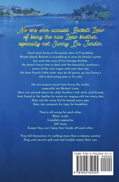 His best friend's little sister is not an option. No one ever accused Beckett Loew of being the nice Loew brother, especially not Sunny Du Jardin. Stuck back home in the quirky town of Friendship, Rhode Island, Beckett is scrambling to save his family's oyster bar and take care of his teenage brother. He doesn't have time to deal with the beautiful, sunshine-y owner of the new vegan cafe next door too. His best friend's little sister may be all grown up, but Sunny's still a distracting pain in his side. No one expects much from Sunny Du Jardin, especially not Beckett Loew. She's not worried about her older brother's tall, dark, and broody best friend or the battles he insists on waging with her every day. She's not the same kid he teased years ago. Now, she composts his type for breakfast. They're all wrong for each other. Bitter rivals. Complete opposites. Off limits. Except they can't keep their hands off each other. They tell themselves it's nothing more than a steamy summer fling until secrets spill and real trouble comes their way. CW: chronic illness (epilepsy), mention of childhood bullying, putting the fun in dysfunctional families, parents who turn into accidental criminals, incarceration, open door spice, suspense and moments of peril.