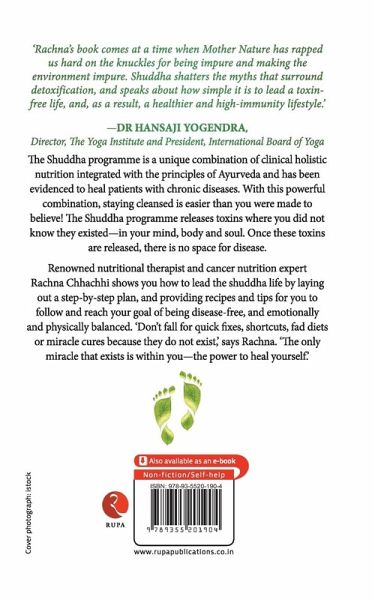 'Rachna's book comes at a time when Mother Nature has rapped us hard on the knuckles for being impure and making the environment impure. Shuddha shatters the myths that surround detoxification, and speaks about how simple it is to lead a toxin-free life, and, as a result, a healthier and high-immunity lifestyle.' -DR HANSAJI YOGENDRA, Director, The Yoga Institute and President, International Board of Yoga The Shuddha programme is a unique combination of clinical holistic nutrition integrated with the principles of Ayurveda and has been evidenced to heal patients with chronic diseases. With this powerful combination, staying cleansed is easier than you were made to believe! The Shuddha programme releases toxins where you did not know they existed-in your mind, body and soul. Once these toxins are released, there is no space for diseases. Renowned nutritional therapist and cancer nutrition expert Rachna Chhachhi shows you how to lead the shuddha life by laying out a step-by-step plan, and providing recipes and tips for you to follow and reach your goal of being disease-free, and emotionally and physically balanced. 'Don't fall for quick fixes, shortcuts, fad diets or miracle cures because they do not exist,' says Rachna. 'The only miracle that exists is within you-the power to heal yourself.'