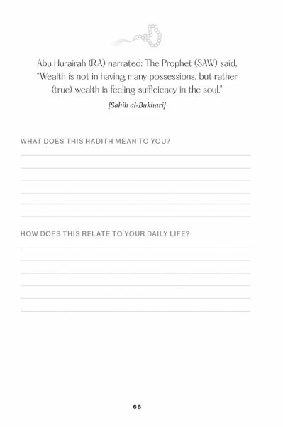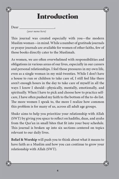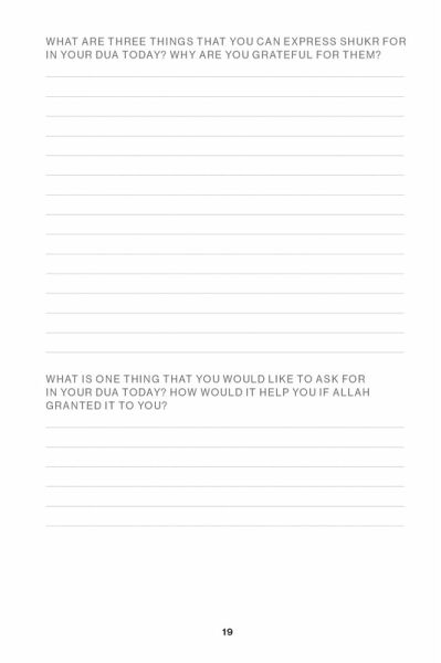 Strengthen your connection to your faith with this Islamic prayer journal designed specifically for Muslim women, featuring inspirational duas, hadith, and verses from the Qur'an. As women, we are often required to wear many hats that come with various obligations, both in our careers and our personal lives. It can feel as if there is little time left for self-care—physically, mentally, emotionally, and especially spiritually. Your vessel on a journey of deep devotional reflection, this journal aims to bring greater meaning to the words you may hear, read, or recite in worship and offers an opportunity to truly absorb and connect with them. With guided prompts and space for reflection, this book will help you think about the religious significance and context of each dua, hadith, and verse and will encourage you to contemplate how you can apply them to your daily life. Undated entries offer space to reflect any time of the year and flexibility for even the busiest of schedules. Take your spiritual connection to the next level with Shukr.