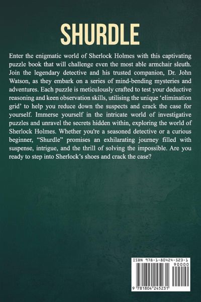 "When you have eliminated all which is impossible, then whatever remains, however improbable, must be the truth." Sherlock Holmes Enter the enigmatic world of Sherlock Holmes with this captivating puzzle book that will challenge even the most able armchair sleuth. Join the legendary detective and his trusted companion, Dr John Watson, as they embark on a series of mind-bending mysteries and adventures. Using the original Sir Arthur Conan Doyle detective stories, each puzzle is meticulously crafted to test your deductive reasoning and keen observation skills, utilising the unique 'elimination grid' to help you reduce down the suspects and crack the case yourself. With 15 of Sir Arthur Conan Doyle's greatest mysteries to solve, immerse yourself in the intricate world of Victorian and Edwardian London and unravel the secrets hidden within, exploring the world of Sherlock Holmes as Conan Doyle intended it. Whether you're a seasoned detective or a curious beginner new to the Sherlock Holmes canon, "Shurdle" promises an exhilarating journey filled with suspense, intrigue, and the thrill of solving the impossible. Are you ready to step into Sherlock's shoes and crack the case?