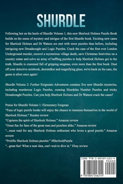 Following hot on the heels of Shurdle Volume 1, this new Sherlock Holmes Puzzle Book builds on the sense of mystery and intrigue of the first Shurdle book. Exciting new cases for Sherlock Holmes and Dr Watson are met with more puzzles than before, including intriguing new Dreadnought and Logic Puzzles. Crack the case of the first ever London Underground murder, unravel a mysterious village death, save Christmas festivities on a country estate and solve an array of baffling puzzles to help Sherlock Holmes get to the truth. Shurdle is crammed full of gripping enigmas, even more than the first book. Dust off your detective notebook, deerstalker and magnifying glass, we're back on the case, the game is afoot once again!Shurdle Volume 2: Further Enigmatic Adventures contains five new Shurdle mysteries, including murderous Logic Puzzles, cunning Shurdoku Number Puzzles and tricky Dreadnought Puzzles. Can you help Sherlock Holmes and Dr Watson crack the cases?