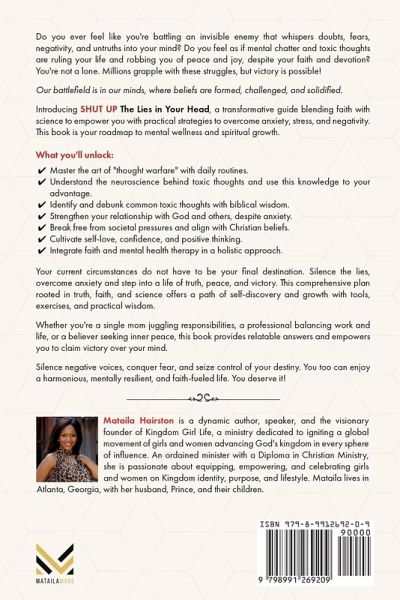 Mataila Hairston is a dynamic author, speaker, coach and the visionary founder of Kingdom Girl Life, a ministry dedicated to raising up a global movement of girls and women advancing the kingdom of God in every sphere of influence. With a passion for equipping, empowering, and celebrating women, Mataila focuses on Kingdom identity, purpose, and lifestyle, inspiring countless individuals to live out their faith boldly.As an ordained minister with a Diploma in Christian Ministry, Mataila's work is rooted in deep spiritual and theological understanding. With her footprint in media and real estate, her ministry extends beyond traditional boundaries, making her a well-respected figure both locally and internationally. Her teachings and insights have touched lives around the world, providing wisdom and encouragement to those seeking personal and spiritual growth.Mataila's latest book, 'Shut Up The Lies in Your Head,' offers a powerful guide for women to overcome toxic thoughts with life-transforming truths grounded in biblical principles and science. Through her writing, she provides practical tools and faith-based solutions, encouraging women to uncover and replace the lies they have grown to believe about themselves with the empowering truths found in God's Word.Mataila resides in Atlanta, Georgia, with her husband and their children. Her infectious enthusiasm and unwavering faith continue to inspire and uplift women around the world, making her a beacon of hope and inspiration. Mataila's mission is to see women everywhere live confidently and purposefully, fully embracing their God-given identity and potential.