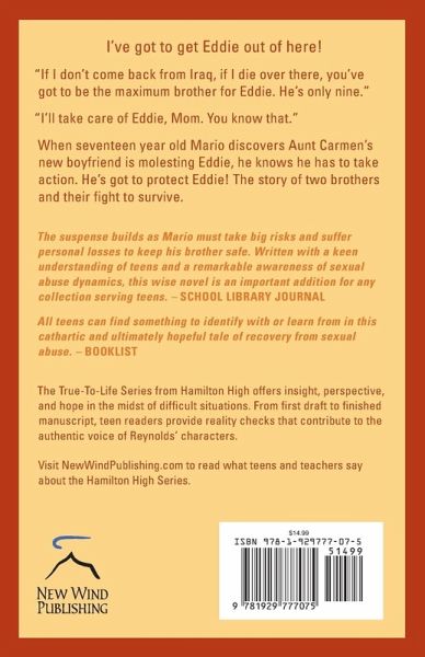 When their mother is called to Iraq with her National Guard unit, 17-year-old Mario Barajas and his 10-year-old brother, Eddie, move in with their Aunt Carmen. Eddie, hungry for the love of a father, happily soaks up the attention their aunt's boyfriend, Denton, freely gives. Mario is caught up with a girlfriend who is his first love, with high school soccer, and with work. He barely notices as his little brother becomes more and more withdrawn. Then, returning home earlier than expected one evening, he walks in on the terrible secret. Mario must take desperate measures to protect Eddie. This is a gripping tale of trust, betrayal, and secrets that should never be kept. Above all, this is the story of the bond of love between two brothers.