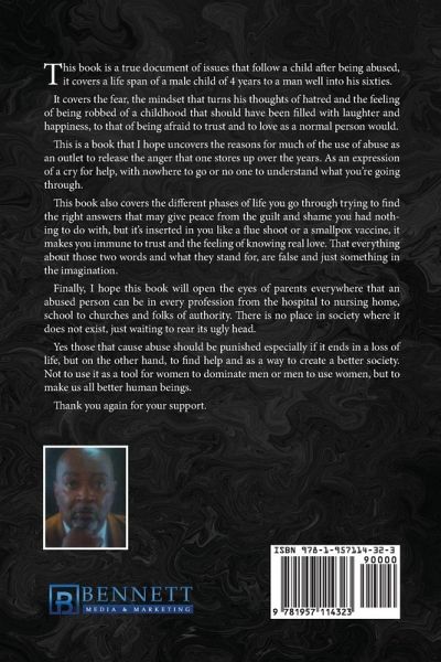 This book is a true document of issues that follow a child after being abused, it covers a life span of a male child of 4 years to a man well into his sixties. It covers the fear, the mindset that turns his thoughts of hatred and the feeling of being robbed of a childhood that should have been filled with laughter and happiness, to that of being afraid to trust and to love as a normal person would. This is a book that I hope uncovers the reasons for much of the use of abuse as an outlet to release the anger that one stores up over the years. As an expression of a cry for help, with nowhere to go or no one to understand what you're going through. This book also covers the different phases of life you go through trying to find the right answers that may give peace from the guilt and shame you had nothing to do with, but it's inserted in you like a flue shoot or a smallpox vaccine, it makes you immune to trust and the feeling of knowing real love. That everything about those two words and what they stand for, are false and just something in the imagination. Finally, I hope this book will open the eyes of parents everywhere that an abused person can be in every profession from the hospital to nursing home, school to churches and folks of authority. There is no place in society where it does not exist, just waiting to rear its ugly head.Yes those that cause abuse should be punished especially if it ends in a loss of life, but on the other hand, to find help and as a way to create a better society. Not to use it as a tool for women to dominate men or men to use women, but to make us all better human beings. Thank you again for your support.