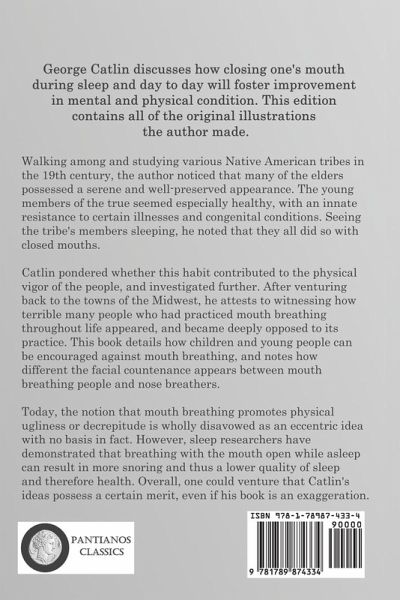 George Catlin discusses how closing one's mouth during sleep and day to day will foster improvement in mental and physical condition. This edition contains all of the original illustrations the author made. Walking among and studying various Native American tribes in the 19th century, the author noticed that many of the elders possessed a serene and well-preserved appearance. The young members of the tribe seemed especially healthy, with an innate resistance to certain illnesses and congenital conditions. Seeing the tribe's members sleeping, he noted that they all did so with closed mouths. Catlin pondered whether this habit contributed to the physical vigor of the people, and investigated further. After venturing back to the towns of the Midwest, he attests to witnessing how terrible many people who had practiced mouth breathing throughout life appeared, and became deeply opposed to its practice. This book details how children and young people can be encouraged against mouth breathing, and notes how different the facial countenance appears between mouth breathing people and nose breathers. Today, the notion that mouth breathing promotes physical ugliness or decrepitude is wholly disavowed as an eccentric idea with no basis in fact. However, sleep researchers have demonstrated that breathing with the mouth open while asleep can result in more snoring and thus a lower quality of sleep and therefore health. Overall, one could venture that Catlin's ideas possess a certain merit, even if his book is an exaggeration. Although primarily known today as a painter and traveller who became an emissary of sorts to the Plains tribes, George Catlin was also an enthusiastic if occasional writer. He admired the Native American peoples for their traditions and distinctive appearance, and took to painting them - his marked talent led to their respect for his gifts, and they duly welcomed him with friendship.