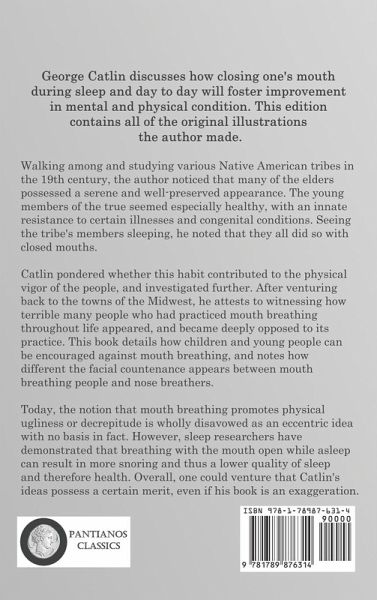 George Catlin discusses how closing one's mouth during sleep and day to day will foster improvement in mental and physical condition. This edition contains all of the original illustrations the author made. Walking among and studying various Native American tribes in the 19th century, the author noticed that many of the elders possessed a serene and well-preserved appearance. The young members of the tribe seemed especially healthy, with an innate resistance to certain illnesses and congenital conditions. Seeing the tribe's members sleeping, he noted that they all did so with closed mouths. Catlin pondered whether this habit contributed to the physical vigor of the people, and investigated further. After venturing back to the towns of the Midwest, he attests to witnessing how terrible many people who had practiced mouth breathing throughout life appeared, and became deeply opposed to its practice. This book details how children and young people can be encouraged against mouth breathing, and notes how different the facial countenance appears between mouth breathing people and nose breathers. Today, the notion that mouth breathing promotes physical ugliness or decrepitude is wholly disavowed as an eccentric idea with no basis in fact. However, sleep researchers have demonstrated that breathing with the mouth open while asleep can result in more snoring and thus a lower quality of sleep and therefore health. Overall, one could venture that Catlin's ideas possess a certain merit, even if his book is an exaggeration. Although primarily known today as a painter and traveller who became an emissary of sorts to the Plains tribes, George Catlin was also an enthusiastic if occasional writer. He admired the Native American peoples for their traditions and distinctive appearance, and took to painting them - his marked talent led to their respect for his gifts, and they duly welcomed him with friendship.