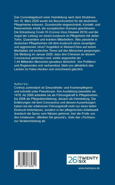 Am 16. März 2020 wurde ein Besuchsverbot für die deutschen Pflegeheime erlassen, Grundrechte eingeschränkt, Kontakt- und Reiseverbote erteilt, die europäischen Grenzen geschlossen. Die Erkrankung Covid-19 (Corona Virus Disease 2019) und die Angst der Leitung vor einem Ausbruch im Pflegeheim mit vielen Toten, Quarantäne und kranken Mitarbeitern wird hier als ein Corona Tagebuch beschrieben. Was passierte in deutschen Pflegeheimen mit dem Ausbruch eines aggressiven Virus? Angeblich in Wuhan / China auf einem Marktplatz mit exotischen Tieren auf den Menschen gesprungen. Die Meldung im Januar 2020, dass drei Chinesen an diesem Corona Virus gestorben sind, wirkte angesichts der 1,44 Milliarden Menschen geradezu lächerlich. Von Politikern und Regierenden erst verharmlost, blieb uns allmählich das Lachen im Halse stecken.