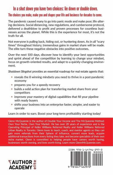 In a shutdown you have two choices: lie down or double down. The choices you make, make you and shapes your life and business for decades to come. The pandemic caused many to go into panic mode and make poor, life-altering decisions. Social distancing, new regulations, and cumbersome protocol, delivered a death blow to profit and proven processes for countless businesses across the planet. While this is the experience for most, it's not the truth for all. Not everyone is pulling back, hiding out, or hunkering down. As in all "scary times" throughout history, tremendous gains in market share will be made. The elite turn these negative obstacles into positive outcomes. Over the next 100 days, discover how to identify your best opportunities and sprint ahead of the competition by learning to change your mindset, focus on growth-oriented results, and adapt to a quickly-changing environment. Shutdown Slingshot provides an essential roadmap for real estate agents that:reveals the 8 winning mindsets you need to thrive in a post-pandemic economy prepares you for a speedy recovery builds a solid action plan for transferring market share from your competitors improves your mastery of digital capabilities that fill your pipeline with ready buyers shifts your business into an enterprise faster, simpler, and easier to operate Learn in order to earn. Boost your long-term profitability starting today!