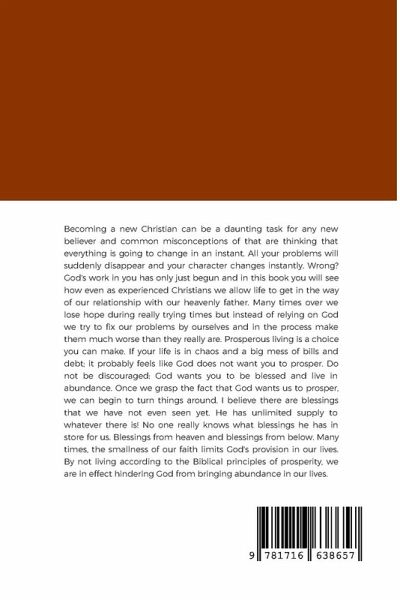 Becoming a new Christian can be a daunting task for any new believer and common misconceptions of that are thinking that everything is going to change in an instant. All your problems will suddenly disappear and your character changes instantly. Wrong? God's work in you has only just begun and in this book you will see how even as experienced Christians we allow life to get in the way of our relationship with our heavenly father. Many times over we lose hope during really trying times but instead of relying on God we try to fix our problems by ourselves and in the process make them much worse than they really are. Prosperous living is a choice you can make. If your life is in chaos and a big mess of bills and debt; it probably feels like God does not want you to prosper. Do not be discouraged: God wants you to be blessed and live in abundance. Once we grasp the fact that God wants us to prosper, we can begin to turn things around. I believe there are blessings that we have not even seen yet. He has unlimited supply to whatever there is! No one really knows what blessings he has in store for us. Blessings from heaven and blessings from below. Many times, the smallness of our faith limits God's provision in our lives. By not living according to the Biblical principles of prosperity, we are in effect hindering God from bringing abundance in our lives.