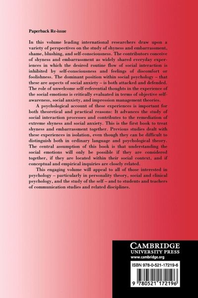 In this 1990 volume leading international researchers draw upon a variety of perspectives on the study of shyness and embarrassment, shame, blushing and self-consciousness. The contributors conceive of shyness and embarrassment as widely shared everyday experiences in which the desired routine flow of social interaction is inhibited by self-consciousness and feelings of discomfort or foolishness. The dominant position within social psychology - that these are aspects of social anxiety - is both attacked and defended. The role of unwelcome self-referential thoughts in the experience of the social emotions is critically evaluated in terms of objective self-awareness, social anxiety, and impression management theories. This engaging volume will appeal to all of those interested in psychology - particularly in personality theory, social and clinical psychology, and the study of the self - and to students and teachers of communication studies and related disciplines.