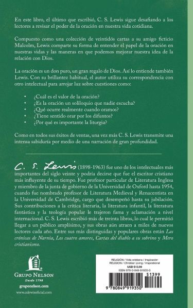 Compuestas como una colección de envíos ficticios a su amigo Malcolm, Si Dios no escuchase: Cartas a Malcolm acerca de la oración considera esta muestra básica de devoción en su forma, contenido y regularidad, y las maneras en que refleja nuestra fe y moldea nuestra forma de creer. En esta edición de la ficticia colección de cartas de C. S. Lewis, el venerado autor reflexiona sobre la naturaleza de la oración: qué es, cómo funciona y cómo debe practicarse. La oración es un don puro, un gran regalo de Dios. Así lo entiende también Lewis. Con su brillantez habitual, el autor utiliza su correspondencia con otro intelectual para arrojar luz sobre cuestiones como: * ¿Cuál es el valor de la oración? * ¿Es la oración un soliloquio que nadie escucha? * ¿Qué ocurre realmente cuando oramos? * ¿Tiene sentido orar por los difuntos? * ¿Por qué es importante la liturgia? En sus argumentos, Lewis muestra una fuerte convicción y, al mismo tiempo, una gran sensibilidad y comprensión hacia las debilidades y temores del hombre. Aunque Lewis nunca pretendió que este fuera un libro de instrucciones sobre cómo orar, descubrió que el formato de correspondencia le permitía compartir sus reflexiones de forma dinámica y personal. Si Dios no escuchase: Cartas a Malcom acerca de la oración fue el último libro que terminó C. S. Lewis. Publicado póstumamente en enero de 1964, tres meses después de su muerte, es uno de los mejores libros de Lewis, aunque quizá no uno de los más conocidos. Letters To Malcom: Chiefly on Prayer Composed as a collection of fictitious dispatches to his friend, Malcolm, Letters to Malcolm: Chiefly on Prayer considers this basic display of devotion in its form, content, and regularity, and the ways it both reflects our faith and shapes how we believe. In this edition of C. S. Lewis's fictitious collection of letters, the revered author ruminates on the nature of prayer--what it is, how it works, and how it should be practiced. Prayer is a pure gift, a great gift from God. This is also how Lewis understands it. With his usual brilliance, the author uses his correspondence with another intellectual to shed light on questions such as: * What is the value of prayer? * Is prayer a soliloquy that no one listens to? * What is happening when we pray? * Does it make sense to pray for the deceased? * Why is liturgy important? In his arguments, Lewis shows a strong conviction and, at the same time, a great sensitivity and understanding for the weaknesses and fears of man.While Lewis never intended this to be a book of instruction on how to pray, he found that the correspondence format enabled him to share his reflections in a dynamic and personal way. Letters to Malcolm: Chiefly on Prayer was the last book C. S. Lewis finished. Published posthumously in January 1964, three months after his death, it is one of Lewis's best books though perhaps not one of his best known.