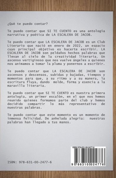 ¿Qué te puedo contar? Te puedo contar que SI TE CUENTO es una antología narrativa y poética de LA ESCALERA DE JACOB. Te puedo contar que LA ESCALERA DE JACOB es un Club Literario que nació en enero de 2022, un espacio cuyo principal objetivo es hacerte escribir. LA ESCALERA DE JACOB son peldaños hechos palabras que llevan al cielo de la creatividad literaria. Un ascenso vertiginoso que nos vuelve ángeles a quienes nos animamos a tomar la pluma y ponernos a escribir. Te puedo contar que LA ESCALERA DE JACOB son ascensos y descensos, subidas y bajadas, tiempos y momentos para que, a su ritmo y a su manera, la escritura fluya, dando molde, forma y esencia a la maravilla literaria. Te puedo contar que SI TE CUENTO es nuestra primera antología, un primer escalón, en el que nos hemos reunido quienes formamos parte del club y hemos decidido compartir lo más representativo de nuestras palabras. Te puedo contar que este momento es un momento de inmensa felicidad. De anhelada alegría: nuestras palabras han llegado a tus manos.