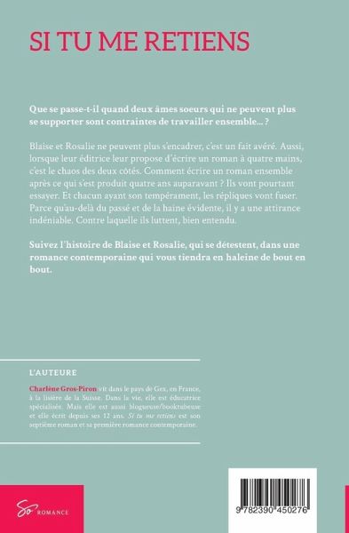Que se passe-t-il quand deux âmes soeurs qui ne peuvent plus se supporter sont contraintes de travailler ensemble... ? Blaise et Rosalie ne peuvent plus s¿encadrer, c¿est un fait avéré. Aussi, lorsque leur éditrice leur propose d¿écrire un roman à quatre mains, c¿est le chaos des deux côtés. Comment écrire un roman ensemble après ce qui s¿est produit quatre ans auparavant ? Ils vont pourtant essayer. Et chacun ayant son tempérament, les répliques vont fuser. Parce qüau-delà du passé et de la haine évidente, il y a une attirance indéniable. Contre laquelle ils luttent, bien entendu. Suivez l'histoire de Blaise et Rosalie, qui se détestent, dans une romance contemporaine qui vous tiendra en haleine de bout en bout. EXTRAIT Il s¿approcha d¿elle, faisant signe à ses compagnons pour la soirée. Il se passerait désormais de leur entourage jusqüà temps de les ramener. S¿il fallait les ramener, puisque normalement, il avait pris ses précautions pour cette nuitée. Il avait beau être le « Sam » de service, cette fois-ci ferait défaut. Quelqüun d¿autre s¿y collerait. Rose s¿écarta un peu de son groupe, préférant jouer la sécurité. Tant qüil n¿avait pas donné le bon mot de passe, elle ne bougerait pas plus. Même si elle ne détenait, en vérité, aucun doute quant à son identité. C¿était forcément lui, superbement charmeur, plus que ses écrits qui avaient laissé émaner une certaine rudesse qui ne transparaissait pas de prime abord sur sa personne. Bientôt, ils furent l¿un devant l¿autre, trop proches pour deux inconnus, trop éloignés pour un duo en boîte. Blaise attendit avec impatience la question fatidique, puis la cadette Armand se décida enfin, un fin sourire aux lèvres : ¿ Mot de passe ? ¿ Lapin crétin. La jeune fille partit dans un grand éclat de rire que Blaise ne put qüadmirer. Il ne s¿était pas encore rendu compte qüil était déjà totalement envoûté. À PROPOS DE L'AUTEUR Charlène Gros-Piron vit dans le pays de Gex, en France, à la lisière de la Suisse. Dans la vie, elle est éducatrice spécialisée. Mais elle est aussi blogueuse/booktubeuse et elle écrit depuis ses 12 ans. Si tu me retiens est son septième roman et sa première romance contemporaine.