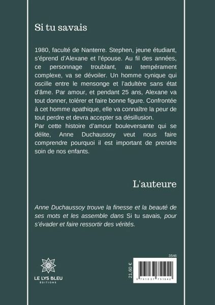 1980, faculté de Nanterre. Stephen, jeune étudiant, s¿éprend d¿Alexane et l'épouse. Au fil des années, ce personnage troublant, au tempérament complexe, va se dévoiler. Un homme cynique qui oscille entre le mensonge et l¿adultère sans état d¿âme. Par amour, et pendant 25 ans, Alexane va tout donner, tolérer et faire bonne figure. Confrontée à cet homme apathique, elle va connaître la peur de tout perdre et devra accepter sa désillusion. Par cette histoire d¿amour bouleversante qui se délite, Anne Duchaussoy veut nous faire comprendre pourquoi il est important de prendre soin de nos enfants.
