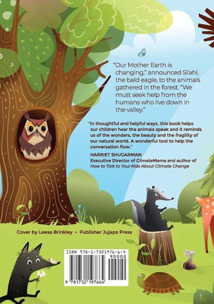 A delightful story in which a group of animals living in the wild contact humans to ask for their help due to affects of climate change on their habitats. The humans become aware that their actions over many years have affected the lives of these animals. With help from the likes of Braveheart Black Bear and Chatty Gray Squirrel, and guided by Si'ahl, the bald eagle, who is the head of the Council of Animals, the animals figure out an ingenious way to let the humans know they need their help. The humans then begin to understand and begin to make changes in their community which will help not only the animals, but the humans too, since they will be helping to fight climate change. Parents can use this book to start a conversation about climate change with children.