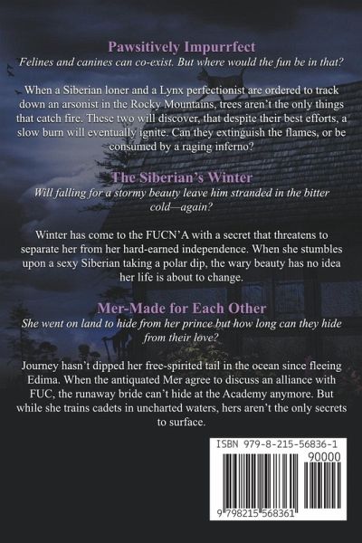Siberians and Kings Books 1-3 Pawsitively Impurrfect Felines and canines can co-exist. But where would the fun be in that? When a Siberian loner and a Lynx perfectionist are ordered to track down an arsonist in the Rocky Mountains, trees aren't the only things that catch fire. These two will discover, that despite their best efforts, a slow burn will eventually ignite. Can they extinguish the flames, or be consumed by a raging inferno? The Siberian's Winter Will falling for a stormy beauty leave him stranded in the bitter cold—again? Winter has come to the FUCN'A with a secret that threatens to separate her from her hard-earned independence. When she stumbles upon a sexy Siberian taking a polar dip, the wary beauty has no idea her life is about to change. Mer-Made for Each Other She went on land to hide from her prince but how long can they hide from their love? Journey hasn't dipped her free-spirited tail in the ocean since fleeing Edima. When the antiquated Mer agree to discuss an alliance with FUC, the runaway bride can't hide at the Academy anymore. But while she trains cadets in uncharted waters, hers aren't the only secrets to surface.