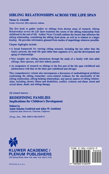 When one begins to examine the existing literature dealing with siblings, one soon becomes aware that many separate domains of sibling research exist and that there is little connection between them; for example, sibling relationships in early childhood, genetic and environmental influences on individual differences between siblings, dysfunctional sibling relation ships, adult sibling helping relationships, sibling violence and abuse, and so on. The author's aim in writing this book was to attempt to bring together for the first time studies from diverse areas of sibling research into a single volume. The book is a summary and integration of the various domains of sibling studies, extending across the life span where studies exist to make this possible. Although many gaps in the sibling research literature within and between domains of study and over the life span still exist, it is hoped that this book will motivate others to help fill in the gaps by suggesting direc tions wherefurther research is needed.