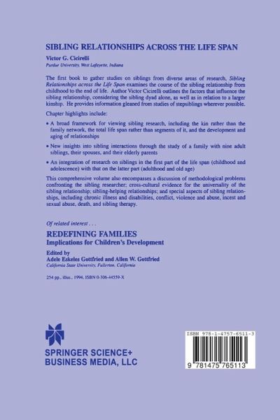 When one begins to examine the existing literature dealing with siblings, one soon becomes aware that many separate domains of sibling research exist and that there is little connection between them; for example, sibling relationships in early childhood, genetic and environmental influences on individual differences between siblings, dysfunctional sibling relation ships, adult sibling helping relationships, sibling violence and abuse, and so on. The author's aim in writing this book was to attempt to bring together for the first time studies from diverse areas of sibling research into a single volume. The book is a summary and integration of the various domains of sibling studies, extending across the life span where studies exist to make this possible. Although many gaps in the sibling research literature within and between domains of study and over the life span still exist, it is hoped that this book will motivate others to help fill in the gaps by suggesting direc tions wherefurther research is needed.