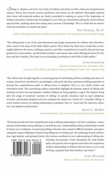 Forward Preface List of Abbreviations Introduction: All in the Family: Maintaining and Making Connections Chapter 1: Full, Half, Step, Foster, Adoptive, and Other: The Complex Nature of Sibling Relationships Chapter 2: Siblings in Foster Care and Adoption: What We Know from Research Chapter 3: Sibling Connections: The Importance of Nurturing Sibling Bonds in the Foster Care System Chapter 4: The Experience of Sibling Loss in the Adjustment of Foster and Adopted Children Chapter 5: The Rights of Siblings in Foster Care and Adoption: A Legal Perspective Chapter 6: Sibling Issues in Open Adoption Arrangements: Non-Biologically Related Adopted Siblings Experiences with Birthfamily Contact Chapter 7: Keeping Sibling Connection Alive Chapter 8: The Creation of a False Self: A Survival Strategy for Siblings of Wounded Adopted or Foster Children Chapter 9: Suddenly Sisters! Sibling Adjustment in Reunion Chapter 10: Practice Strategies to Preserve Sibling Relationships Chapter 11: Mental Health Strategies to Support Sibling Relationships: Nonverbal Interventions to Process Trauma and Maintain the Sibling Bond Chapter 12: Permanency for Siblings in Kinship Families Conclusion: What Have We Learned? Where Do We Need To Go? Appendix Notes Glossary References About the contributors