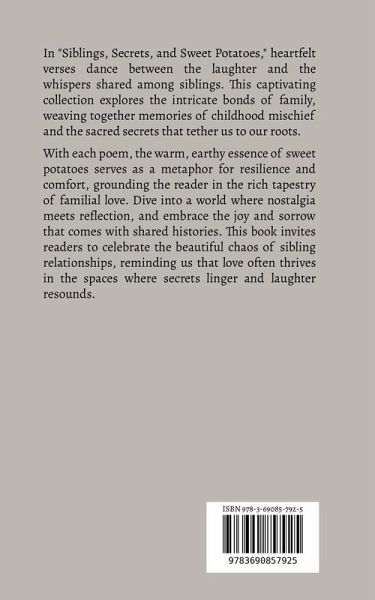 In "Siblings, Secrets, and Sweet Potatoes," heartfelt verses dance between the laughter and the whispers shared among siblings. This captivating collection explores the intricate bonds of family, weaving together memories of childhood mischief and the sacred secrets that tether us to our roots. With each poem, the warm, earthy essence of sweet potatoes serves as a metaphor for resilience and comfort, grounding the reader in the rich tapestry of familial love. Dive into a world where nostalgia meets reflection, and embrace the joy and sorrow that comes with shared histories. This book invites readers to celebrate the beautiful chaos of sibling relationships, reminding us that love often thrives in the spaces where secrets linger and laughter resounds.