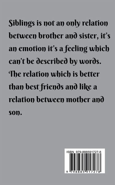 I dedicate this book to all the 'SIBLINGS'. The relation which can't be describe by words. The relationship between siblings is a very important relationship. ""The sibling relationship is one of the longest lasting relationships in most people's lives, and one of the most prevalent"". Although this relationship is almost always a friendly one during adulthood, the childhood and adolescent relationship is usually hostile. Sibling rivalries during adolescence and childhood usually occur because of a strong amount of jealousy towards a younger sibling who appears to be receiving the full amount of attention from the parents. The three most important factors that impact the sibling relationship are birth order, age, and the parent-child or parent-parent relationships. Birth order of siblings can play a huge role in explaining the aggression that some siblings have towards each other. Birth order is one's position in a family. For example, one is the first-born child or one is the middle child. According to Lorie M. Sutter, ""Through your position in the family (birth order) you develop your behavior pattern, way of thinking, and emotional response.