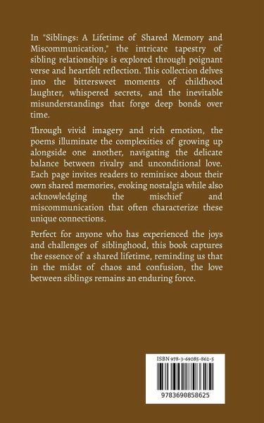 In "Siblings: A Lifetime of Shared Memory and Miscommunication," the intricate tapestry of sibling relationships is explored through poignant verse and heartfelt reflection. This collection delves into the bittersweet moments of childhood laughter, whispered secrets, and the inevitable misunderstandings that forge deep bonds over time. Through vivid imagery and rich emotion, the poems illuminate the complexities of growing up alongside one another, navigating the delicate balance between rivalry and unconditional love. Each page invites readers to reminisce about their own shared memories, evoking nostalgia while also acknowledging the mischief and miscommunication that often characterize these unique connections. Perfect for anyone who has experienced the joys and challenges of siblinghood, this book captures the essence of a shared lifetime, reminding us that in the midst of chaos and confusion, the love between siblings remains an enduring force.