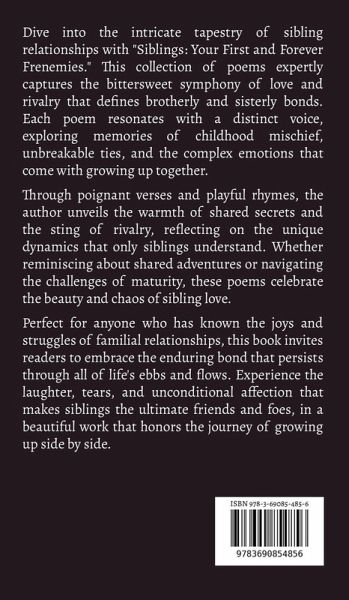 Dive into the intricate tapestry of sibling relationships with "Siblings: Your First and Forever Frenemies." This collection of poems expertly captures the bittersweet symphony of love and rivalry that defines brotherly and sisterly bonds. Each poem resonates with a distinct voice, exploring memories of childhood mischief, unbreakable ties, and the complex emotions that come with growing up together. Through poignant verses and playful rhymes, the author unveils the warmth of shared secrets and the sting of rivalry, reflecting on the unique dynamics that only siblings understand. Whether reminiscing about shared adventures or navigating the challenges of maturity, these poems celebrate the beauty and chaos of sibling love. Perfect for anyone who has known the joys and struggles of familial relationships, this book invites readers to embrace the enduring bond that persists through all of life's ebbs and flows. Experience the laughter, tears, and unconditional affection that makes siblings the ultimate friends and foes, in a beautiful work that honors the journey of growing up side by side.