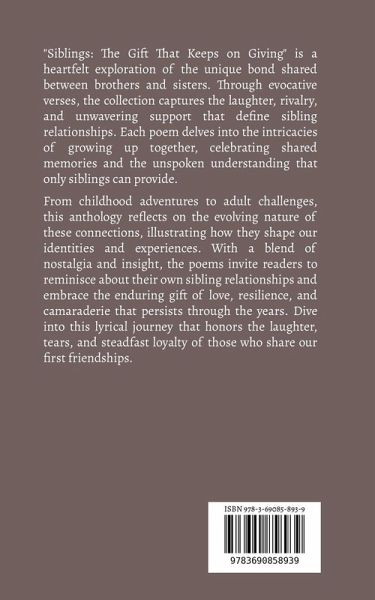 "Siblings: The Gift That Keeps on Giving" is a heartfelt exploration of the unique bond shared between brothers and sisters. Through evocative verses, the collection captures the laughter, rivalry, and unwavering support that define sibling relationships. Each poem delves into the intricacies of growing up together, celebrating shared memories and the unspoken understanding that only siblings can provide. From childhood adventures to adult challenges, this anthology reflects on the evolving nature of these connections, illustrating how they shape our identities and experiences. With a blend of nostalgia and insight, the poems invite readers to reminisce about their own sibling relationships and embrace the enduring gift of love, resilience, and camaraderie that persists through the years. Dive into this lyrical journey that honors the laughter, tears, and steadfast loyalty of those who share our first friendships.