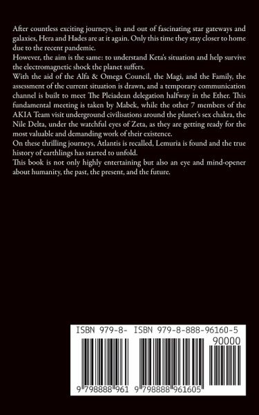 After countless exciting journeys, in and out of fascinating star gateways and galaxies, Hera and Hades are at it again. Only this time they stay closer to home due to the recent pandemic. However, the aim is the same: to understand Keta's situation and help survive the electromagnetic shock the planet suffers. With the aid of the Alfa & Omega Council, the Magi, and the Family, the assessment of the current situation is drawn, and a temporary communication channel is built to meet The Pleiadean delegation halfway in the Ether. This fundamental meeting is taken by Mabek, while the other 7 members of the AKIA Team visit underground civilisations around the planet's sex chakra, the Nile Delta, under the watchful eyes of Zeta, as they are getting ready for the most valuable and demanding work of their existence. On these thrilling journeys, Atlantis is recalled, Lemuria is found and the true history of earthlings has started to unfold. This book is not only highly entertaining but also an eye and mind-opener about humanity, the past, the present, and the future.