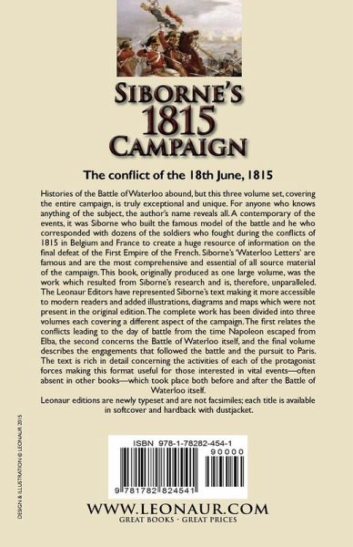 The conflict of the 18th June, 1815 Histories of the Battle of Waterloo abound, but this three volume set, covering the entire campaign, is truly exceptional and unique. For anyone who knows anything of the subject, the author's name reveals all. A contemporary of the events, it was Siborne who built the famous model of the battle and he who corresponded with dozens of the soldiers who fought during the conflicts of 1815 in Belgium and France to create a huge resource of information on the final defeat of the First Empire of the French. Siborne's 'Waterloo Letters' are famous and are the most comprehensive and essential of all source material of the campaign. This book, originally produced as one large volume, was the work which resulted from Siborne's research and is, therefore, unparalleled. The Leonaur Editors have represented Siborne's text making it more accessible to modern readers and added illustrations, diagrams and maps which were not present in the original edition. The complete work has been divided into three volumes each covering a different aspect of the campaign. The first relates the conflicts leading to the day of battle from the time Napoleon escaped from Elba, the second concerns the Battle of Waterloo itself, and the final volume describes the engagements that followed the battle and the pursuit to Paris. The text is rich in detail concerning the activities of each of the protagonist forces making this format useful for those interested in vital events-often absent in other books-which took place both before and after the Battle of Waterloo itself. Leonaur editions are newly typeset and are not facsimiles; each title is available in softcover and hardback with dustjacket.