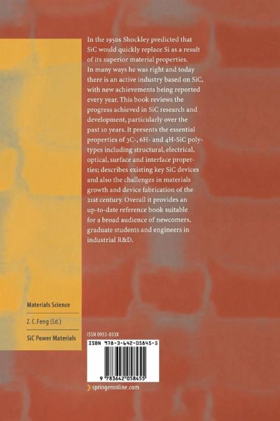 In the 1950s Shockley predicted that SiC would quickly replace Si as a result of its superior material properties. In many ways he was right and today there is an active industry based on SiC, with new achievements being reported every year. This book reviews the progress achieved in SiC research and development, particularly over the past 10 years. It presents the essential properties of 3C-, 6H- and 4H-SiC polytypes including structural, electrical, optical, surface and interface properties; describes existing key SiC devices and also the challenges in materials growth and device fabrication of the 21st century. Overall it provides an up-to-date reference book suitable for a broad audience of newcomers, graduate students and engineers in industrial R&D.