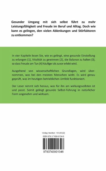 Gesunder Umgang mit sich selbst führt zu mehr Leistungsfähigkeit und Freude im Beruf und Alltag. Doch wie kann es gelingen, den vielen Ablenkungen und Störfaktoren zu entkommen? In vier Kapiteln lesen Sie, wie es gelingt, eine gesunde Einstellung zu erlangen (1), Vitalität zu gewinnen (2), die Balance zu halten (3), so dass Freude am Tun (4) häufiger als zuvor erlebt wird.Ausgehend von wissenschaftlichen Grundlagen, wird übernommen, was bei den meisten Menschen wirkt. Es wird genau geprüft, was im heutigen betrieblichen Umfeld funktioniert. Der Leser nimmt sich heraus, was für ihn am wirkungsvollsten ist und passt. Somit gelingt gesunde Selbst-Führung angenehm und wirksam.