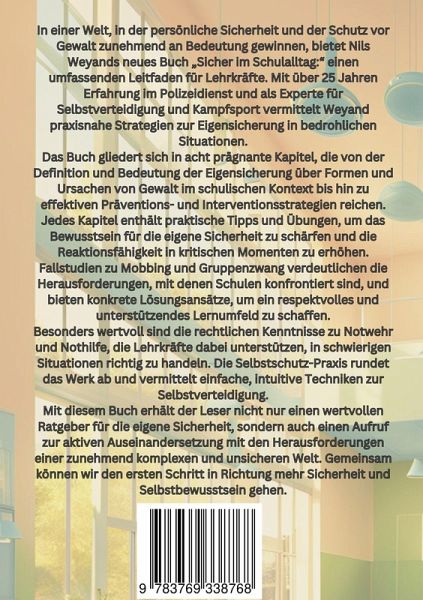 Das Buch von Nils Weyand bietet einen umfassenden Leitfaden zur Eigensicherung und Selbstverteidigung, insbesondere im schulischen Kontext. Es betont die Bedeutung der persönlichen Sicherheit und proaktiven Maßnahmen zur Risikominderung in potenziell gefährlichen Situationen. Der erste Teil des Buches erklärt die verschiedenen Aspekte der Eigensicherung, einschließlich physischer, psychologischer und strategischer Maßnahmen. Praktische Tipps und Übungen helfen den Lesern, ihr Situationsbewusstsein zu schärfen und ihre Reaktionsfähigkeit zu verbessern. Ein zentraler Punkt ist die Auseinandersetzung mit Gewalt in Schulen, die in verschiedenen Formen wie Mobbing, körperlicher Gewalt und Cybermobbing auftritt. Das Buch analysiert die Ursachen und Folgen von Gewalt, sowohl für die Opfer als auch für die Täter, und plädiert für einen ganzheitlichen Ansatz zur Gewaltprävention und -intervention. Rechtliche Aspekte von Notwehr und Nothilfe werden erläutert, wobei die Verantwortung und das rechtliche Handeln von Lehrern und Schülern in kritischen Situationen thematisiert werden. Im weiteren Verlauf des Buches werden grundlegende Selbstverteidigungstechniken vorgestellt, die einfach, intuitiv und effektiv sind. Die Prinzipien der Selbstverteidigung, wie die Notwendigkeit von Klarheit und Intuition, werden hervorgehoben. Das Buch schließt mit einem Appell an die Leser, Verantwortung für ihre Sicherheit zu übernehmen und sich aktiv mit dem Thema auseinanderzusetzen, um in einer zunehmend unsicheren Welt besser gerüstet zu sein. Zusammengefasst bietet das Buch nicht nur praktische Anleitungen zur Eigensicherung und Selbstverteidigung, sondern fördert auch das Bewusstsein für die Bedeutung von Sicherheit im schulischen Umfeld und die Notwendigkeit, Gewalt in jeglicher Form aktiv zu bekämpfen.
