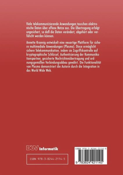 Viele telekommunizierende Anwendungen tauschen elektronische Daten über offene Netze aus. Die Übertragung erfolgt ungesichert, so daß die Daten verändert, abgehört oder verfälscht werden können. Annette Krannig entwickelt eine neuartige Plattform für sichere multimediale Anwendungen (Plasma). Diese ermöglicht sichere Telekommunikation, indem sie Zugriffskontrolle auf kryptographische Schlüssel, Authentisierung der Kommunikationspartner, gesicherte Nachrichtenübertragung und ordnungsgemäßen Verbindungsabbau gewährt. Die Funktionalität von Plasma demonstriert die Autorin durch die Integration in das World Wide Web.