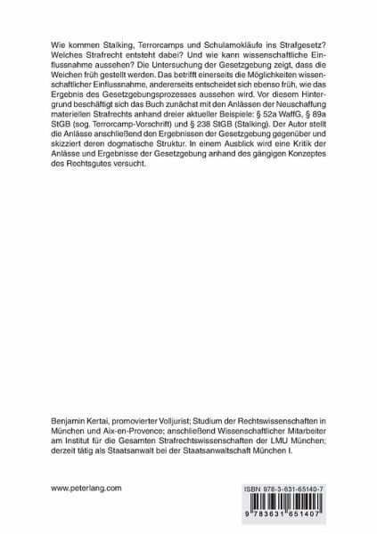 Wie kommen Stalking, Terrorcamps und Schulamokläufe ins Strafgesetz? Welches Strafrecht entsteht dabei? Und wie kann wissenschaftliche Einflussnahme aussehen? Die Untersuchung der Gesetzgebung zeigt, dass die Weichen früh gestellt werden. Das betrifft einerseits die Möglichkeiten wissenschaftlicher Einflussnahme, andererseits entscheidet sich ebenso früh, wie das Ergebnis des Gesetzgebungsprozesses aussehen wird. Vor diesem Hintergrund beschäftigt sich das Buch zunächst mit den Anlässen der Neuschaffung materiellen Strafrechts anhand dreier aktueller Beispiele: