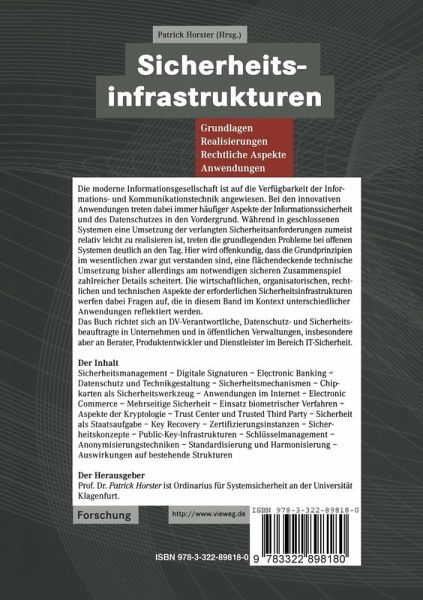 Das Buch behandelt Grundlagen und rechtliche Aspekte moderner Sicherheitsinfrastrukturen sowie deren Realisierung in unterschiedlichen Anwendungen. Die wirtschaftlichen, organisatorischen, rechtlichen und technischen Aspekte der erforderlichen Sicherheitsinfrastrukturen werden in diesem Band behandelt, die im Kontext unterschiedlicher Anwendungen stehen. Hintergrund ist, dass die moderne Informationsgesellschaft auf die Verfügbarkeit der Informations- und Kommunikationstechnik angewiesen ist. Bei den innovativen Anwendungen treten dabei immer häufiger Aspekte der Informationssicherheit und des Datenschutzes in den Vordergrund. Während in geschlossenen Systemen eine Umsetzung der verlangten Sicherheitsanforderungen zumeist relativ leicht zu realisieren ist, treten die grundlegenden Probleme bei offenen Systemen deutlich an den Tag. Hier wird offenkundig, dass die Grundprinzipien im Wesentlichen zwar gut verstanden sind, eine flächendeckende technische Umsetzung bisher allerdings am notwendigen sicheren Zusammenspiel zahlreicher Details scheitert.