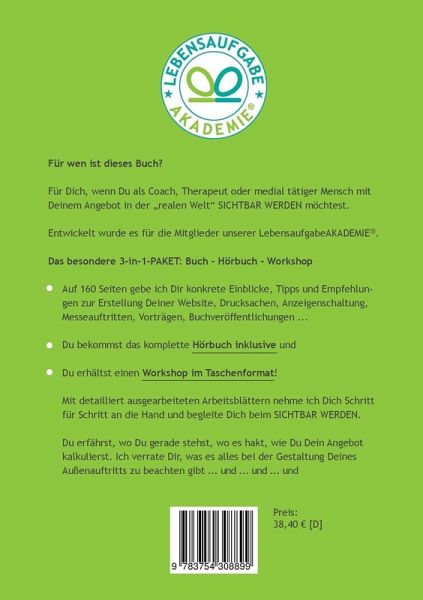 Für wen ist dieses Buch?Für Dich, wenn Du als Coach, Therapeut oder medial tätiger Mensch mit Deinem Angebot in der >>realen Welt<< SICHTBAR WERDEN möchtest.Entwickelt wurde es für die Mitglieder unserer LebensaufgabeAKADEMIE®.Das besondere 3-in-1-PAKET: Buch - Hörbuch - WorkshopAuf 160 Seiten gebe ich Dir konkrete Einblicke, Tipps und Empfehlungen zur Erstellung Deiner Website, Drucksachen, Anzeigenschaltung, Messeauftritten, Vorträgen, Buchveröffentlichungen ...Du bekommst das komplette Hörbuch inklusive undDu erhältst einen Workshop im Taschenformat! Mit detailliert ausgearbeiteten Arbeitsblättern nehme ich Dich Schritt für Schritt an die Hand und begleite Dich beim SICHTBAR WERDEN.Du erfährst, wo Du gerade stehst, wo es hakt, wie Du Dein Angebot kalkulierst. Ich verrate Dir, was es alles bei der Gestaltung Deines Außenauftritts zu beachten gibt ... und ... und ... und