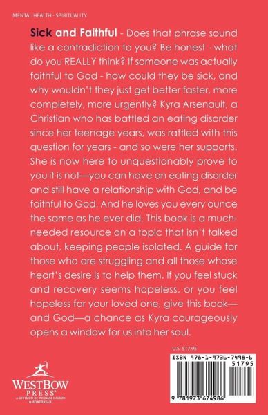 Sick and Faithful - Does that phrase sound like a contradiction to you? Be honest - what do you REALLY think? If someone was actually faithful to God - how could they be sick, and why wouldn't they just get better faster, more completely, more urgently? Kyra Arsenault, a Christian who has battled an eating disorder since her teenage years, was rattled with this question for years - and so were her supports. She is now here to unquestionably prove to you it is not-you can have an eating disorder and still have a relationship with God, and be faithful to God. And he loves you every ounce the same as he ever did. This book is a much-needed resource on a topic that isn't talked about, keeping people isolated. A guide for those who are struggling and all those whose heart's desire is to help them. If you feel stuck and recovery seems hopeless, or you feel hopeless for your loved one, give this book-and God-a chance as Kyra courageously opens a window for us into her soul.