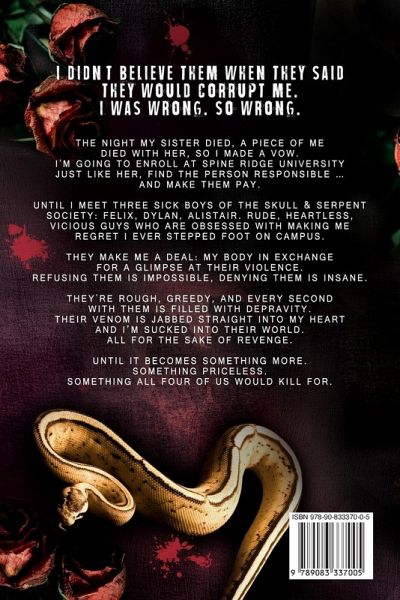 I didn't believe them when they said they would corrupt me. I was wrong. So wrong. The night my sister died, a piece of me died with her, so I made a vow. I'm going to enroll at Spine Ridge University just like her, find the person responsible ... and make them pay. Until I meet three sick boys of the Skull & Serpent Society: Felix, Dylan, Alistair. Rude, heartless, vicious guys who are obsessed with making me regret I ever stepped foot on campus. They make me a deal: My body in exchange for a glimpse at their violence. Refusing them is impossible, denying them is insane. They're rough,…mehr
