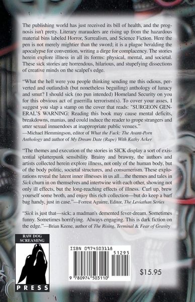 The publishing world has just received its bill of health, and the prognosis isn't pretty. Literary marauders are rising up from the hazardous material bins labeled Horror, Surrealism, and Science Fiction. Here the pen is not merely mightier than the sword; it is a plague heralding the apocalypse for convention, writing a dirge for complacency. The stories herein explore illness in all its forms: physical, mental, and societal. These sick stories are horrendous, hilarious, and stupefying dissections of creative minds on the scalpel's edge.