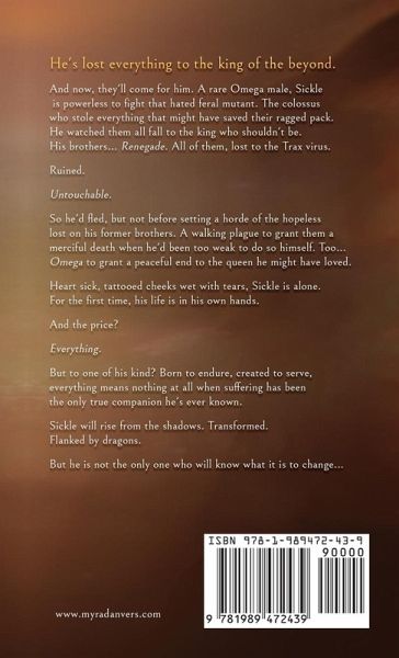 He's lost everything to the king of the beyond. And now, they'll come for him. A rare Omega male, Sickle is powerless to fight that hated feral mutant. The colossus who stole everything that might have saved their ragged pack. He watched them all fall to the king who shouldn't be. His brothers... Renegade. All of them, lost to the Trax virus. Ruined. Untouchable. So he'd fled, but not before setting a horde of the hopeless lost on his former brothers. A walking plague to grant them a merciful death when he'd been too weak to do so himself. Too... Omega to grant a peaceful end to the queen he might have loved. Heart sick, tattooed cheeks wet with tears, Sickle is alone. For the first time, his life is in his own hands. And the price? Everything. But to one of his kind? Born to endure, created to serve, everything means nothing at all when suffering has been the only true companion he's ever known. Sickle will rise from the shadows. Transformed. Flanked by dragons. But he is not the only one who will know what it is to change...