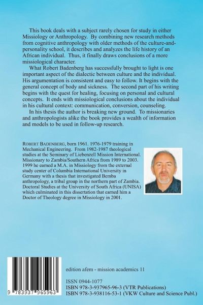 This book deals with a subject rarely chosen for study in either Missiology or Anthropology. By combining new research methods from cognitive anthropology with older methods of the culture-and-personality school, it describes and analyzes the life history of an African individual. Thus, it finally draws conclusions of a more missiological character. What Robert Badenberg has successfully brought to light is one important aspect of the dialectic between culture and the individual. His argumentation is consistent and easy to follow. It begins with the general concept of body and sickness. The second part of his writing begins with the quest for healing, focusing on personal and cultural concepts. It ends with missiological conclusions about the individual in his cultural context: communication, conversion, counseling. In his thesis the author is breaking new ground. To missionaries and anthropologists alike the book provides a wealth of information and models to be used in follow-up research. Robert Badenberg, born 1961. 1976-1979 training in Mechanical Engineering. From 1982-1987 theological studies at the Seminary of Liebenzell Mission International. Missionary to Zambia/Southern Africa from 1989 to 2003. 1999 he earned a M.A. in Missiology from the external study center of Columbia International University in Germany with a thesis that investigated Bemba anthropology, a tribal group in the northern part of Zambia. Doctoral Studies at the University of South Africa (UNISA) which culminated in this dissertation that earned him a Doctor of Theology degree in Missiology in 2001.