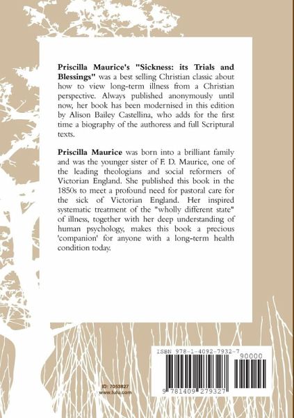 Priscilla Maurice's 'Sickness: its Trials and Blessings' was a best selling Victorian Christian classic on how to handle long-term illness from an informed and traditional Christian perspective. Usually reproduced anonymously, her book has been modernised in this edition by Alison Bailey Castellina, who adds for the first time the author's short biography, as well as full Scripture texts. Priscilla Maurice was born into a large and idealistic Victorian family. The younger sister of theologian and educational reformer F.D.Maurice, her family knew the most influential people of her day. She wrote this book to meet a need by the long-term sick for deeper pastoral care. Her systematic treatment of the "wholly different state" of illness, together with her keen understanding of human behaviour, continues to makes this book a precious companion and gift for those with a long-term health condition.