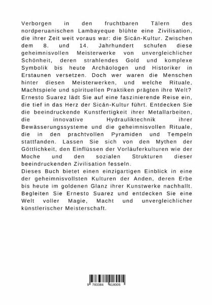 Verborgen in den fruchtbaren Tälern des nordperuanischen Lambayeque blühte eine Zivilisation, die ihrer Zeit weit voraus war: die Sicán-Kultur. Zwischen dem 8. und 14. Jahrhundert schufen diese geheimnisvollen Meisterwerke von unvergleichlicher Schönheit, deren strahlendes Gold und komplexe Symbolik bis heute Archäologen und Historiker in Erstaunen versetzen. Doch wer waren die Menschen hinter diesen Meisterwerken, und welche Rituale, Machtspiele und spirituellen Praktiken prägten ihre Welt?Ernesto Suarez lädt Sie auf eine faszinierende Reise ein, die tief in das Herz der Sicán-Kultur führt. Entdecken Sie die beeindruckende Kunstfertigkeit ihrer Metallarbeiten, die innovative Hydrauliktechnik ihrer Bewässerungssysteme und die geheimnisvollen Rituale, die in den prachtvollen Pyramiden und Tempeln stattfanden. Lassen Sie sich von den Mythen der Göttlichkeit, den Einflüssen der Vorläuferkulturen wie der Moche und den sozialen Strukturen dieser beeindruckenden Zivilisation fesseln.Dieses Buch bietet einen einzigartigen Einblick in eine der geheimnisvollsten Kulturen der Anden, deren Erbe bis heute im goldenen Glanz ihrer Kunstwerke nachhallt. Begleiten Sie Ernesto Suarez und entdecken Sie eine Welt voller Magie, Macht und unvergleichlicher künstlerischer Meisterschaft.