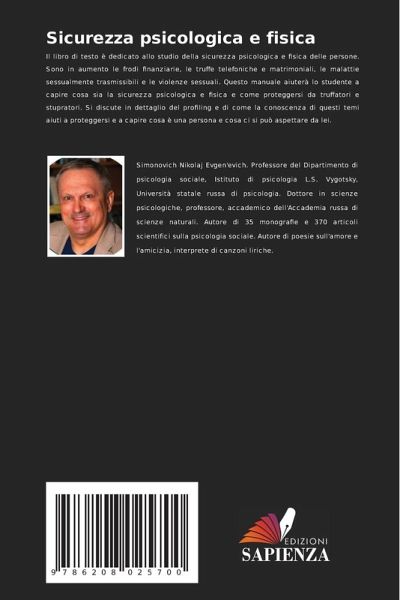 Il libro di testo è dedicato allo studio della sicurezza psicologica e fisica delle persone. Sono in aumento le frodi finanziarie, le truffe telefoniche e matrimoniali, le malattie sessualmente trasmissibili e le violenze sessuali. Questo manuale aiuterà lo studente a capire cosa sia la sicurezza psicologica e fisica e come proteggersi da truffatori e stupratori. Si discute in dettaglio del profiling e di come la conoscenza di questi temi aiuti a proteggersi e a capire cosa è una persona e cosa ci si può aspettare da lei.